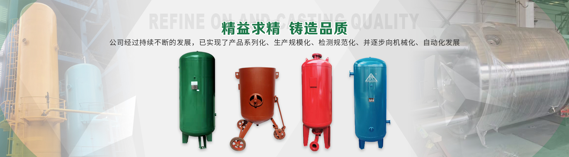 本企業(yè)產(chǎn)品有眾多產(chǎn)品分類,儲(chǔ)氣罐、磨料桶、碳鋼儲(chǔ)氣罐、不銹鋼儲(chǔ)氣罐、中高壓儲(chǔ)氣罐、臥式儲(chǔ)氣罐、緩沖罐、隔膜罐、噴砂罐、分氣缸、以及其他的定做非標(biāo)產(chǎn)品等,產(chǎn)品廣泛應(yīng)用于化工、制藥、橡膠、石油、食品、機(jī)械等行業(yè)。